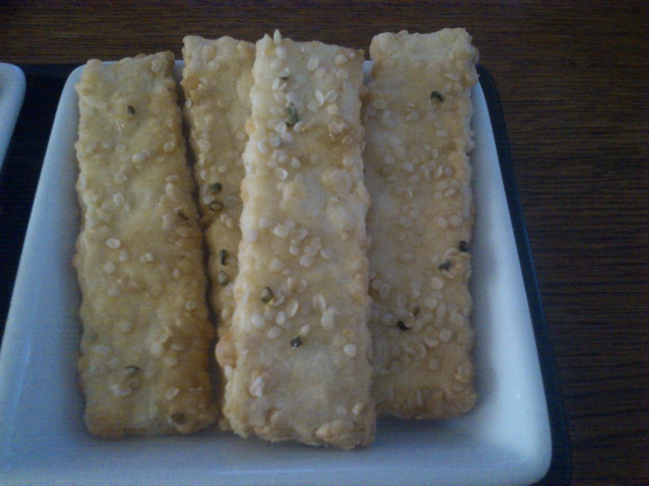 Těsto vyválíme na tenký plát a celý ho potřeme rozšlehaným vejcem. Posypeme solí, paprikou, pepřem, kmínem a nastrouhaným sýrem, na kterém rozhodně nešetříme. Pokud nebudeme sypat sýrem, místo sýru posypeme sezamovými semínky. Těsto nakrájíme na tenké dlouhé tyčinky a dáme péct dozlatova na 200 stupňů.